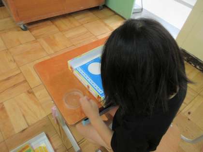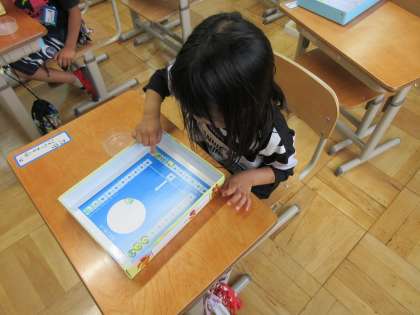 おはじきゲームをしました。10個のおはじきを飛ばすことでいくつといくつに分けられるのかたしかめました。おはじきゲームをノリノリで楽しんでいました。