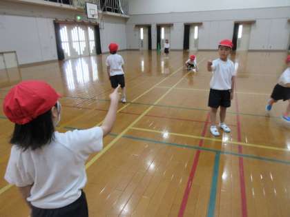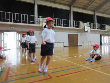 ぐりこの遊びをした後、ケンパステップの場やゴムの場をとびました。リズムよく友だちと仲良くとぶことができていました。