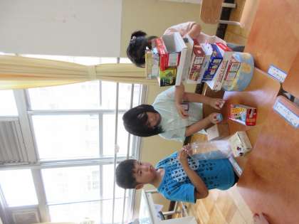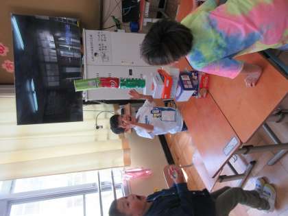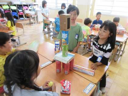 同じ班の友だちと協力して箱を高く積み上げました。どんどん、積み上げる中で、ころがるものがあることや積み上げられないものがあることに気づくことができました。