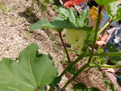 生活科で育てている夏野菜が出来てきました。なすの実はなかなかしっかりした形に育っています。花や実を観察した後、ピーマンやオクラを少しずつですが収穫できました。担当ごとに順番に持ち帰っています。お家で味わってください。