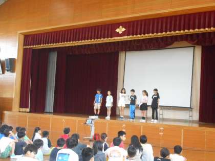 6月の児童集会がありました。はじめに、1学期の歌「ビリーブ」を全校で歌い、その後、計画委員会から今月の目標の発表と図書委員会からのお知らせがありました。