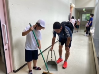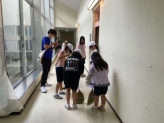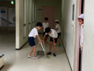 朝のつどいを終え、部屋と廊下の掃除をしています。8時からお待ちかねの朝食です。