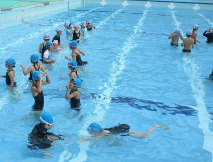 今日は、もぐるや浮くに挑戦しました。最初は怖がっていた子たちも、バディの友だちと励ましながらだんだんと水に慣れています。明日のみずあそびも楽しみです。