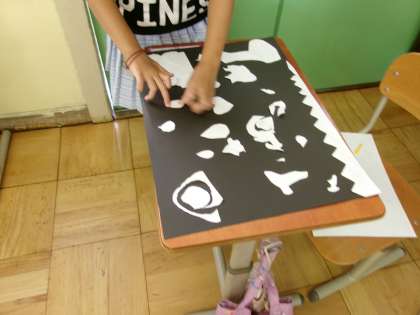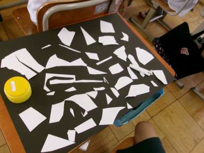 配置が決定したら、丁寧にひとつひとつのりで貼っていきます。決めた配置がずれないように、また貼り残しがないように作業を進めます。できた作品には自分で「ふしぎな町」「人間めいろ」「はたけとかかし」など作品名をつけました。なるほど、そう言われるとそう見えるなぁという面白い作品が仕上がりました。