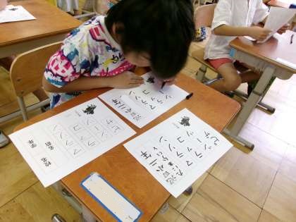 フェルトペンを使って、お手本のカタカナをよく見て書きました。文字の大きさ、画のむき、はね、などに気をつけて1文字1文字慎重に書きました。