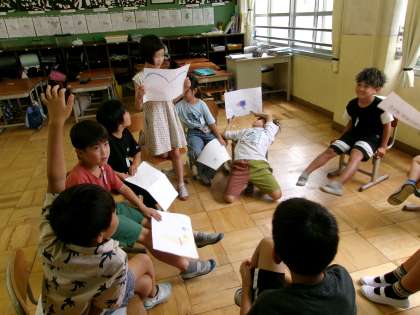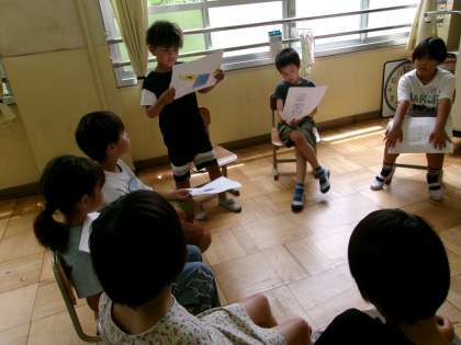 2つのグループに分かれて、自分が考えた「あったらいいなこんなもの」を紹介しました。お友だちの発表を聞いたら、感想を言いたい人がたくさん手を挙げていました。面白そうなものがたくさんあって、「これもいいなぁ、ぼくもほしいです」などの感想が聞かれました。