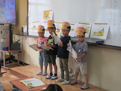 1学期のおわりには、おむすびころりんの音読発表会をしました。
