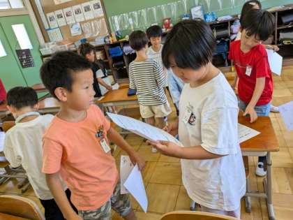 長い夏休みが終わり、今日から2学期です。子どもたちの元気いっぱいの声が教室に響いていました。夏休みにはたっぷり遊んだり、お出かけをしたり、少し夜更かしをしたり・・・楽しい時間を過ごしたようでした。そんな夏休みをふり返りながら「夏休み思い出ビンゴ」を楽しみました。相手に質問をして、更に詳しく話を聞きたい人のところへ行って思い出話をしたり聞いたりしました。2学期はたくさんの行事もあります。子どもたちの成長に期待しています。
