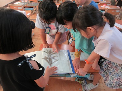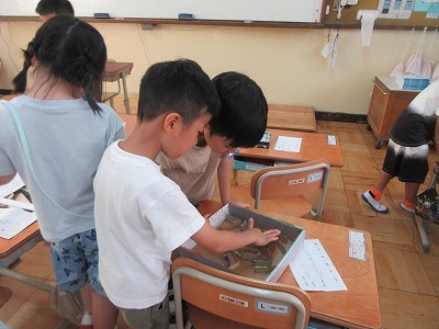 1年生の夏休みの素敵な作品がそろいました。図工室に展示する前に、みんなの作品の良いところ見つけをしました。お家でのご協力ありがとうございました。