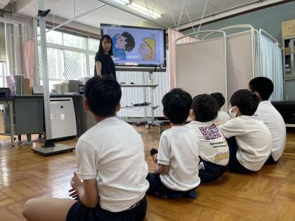 身体計測の前に、養護教諭からけがの応急手当についての話を聞きました。擦り傷をしたとき、鼻血が出たときに自分でできる手当について知ることができました。