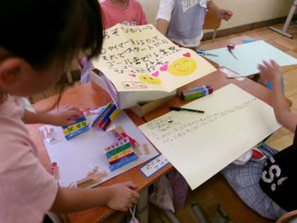 いろんなおもちゃを試してみたので、次はグループでそのおもちゃを使ってどんな遊びをするかを決め、取組んでいます。「ころがす」グループではペットボトルボーリングを制作中です。「くっつく」グループでは楽しいゲームを考えています。いくつかの遊びコーナーを作って1年生に楽しんでもらいたいと活動しています。