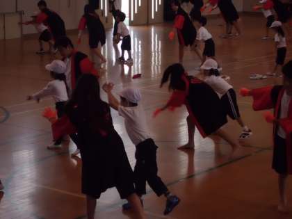 昨年度引き継いだ池田伝統のはっぴを着て,1年生にロックソーランの踊りを教えている様子です。