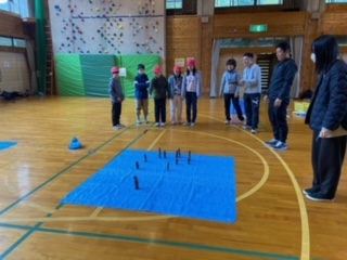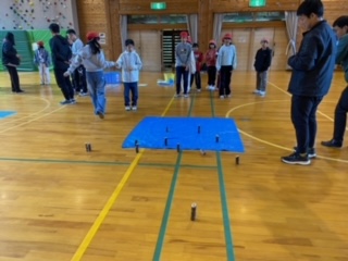 地面が少し乾くまでの間、プレーホールでモルックをしました。だんだんコツを掴み、頭と身体を使って楽しんでいます!