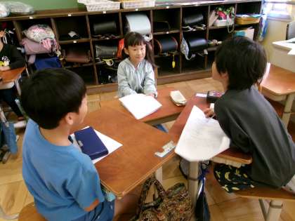 友だちに相談してみたいこと(話題)を決め、少人数グループで話し合い活動をしました。ポイントや話し方、聞き方を確認し、1回目の相談会をしてみました。「ぼくがそうだんしたいことは・・・・です。・・・・・・教えください。」と相談する人から話し始めました。身近な話題が多いので、相談にのる側の人も意見が言いやすかったようです。ただ、「〇〇したらいいんちゃう?」と普段のおしゃべりのようになってしまったグループもありました。次の相談会に向けて気をつけるところをふり返りました。