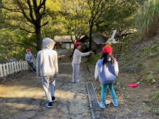 今日の活動のスタートは、フライングディスクゴルフです。みんなでスコアを競って楽しんでいます。
