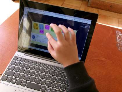 タブレットを使って、くり返しを使った4小節のリズムを作りました。同じリズムを交互に入れている人、3回同じものをくり返している人、様々ですが一度作ったら試してみることをルールにいろんなパターンを作っていました。最後には2人でつなげて8小節のリズムを一緒に打って発表しました。もっとつなげたいという声も出ていました。