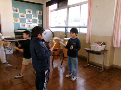 「いろいろな音をさがそう」の学習で、音楽室に行って実際にいろいろな楽器の音を探しました。今日はペアで楽器を選び、楽器でお話をしました。よびかける役とこたえる役になり、リズムをつなげました。お互いに「どうぞ」という気持ちでリズムを演奏すると何度もつなげることができました。