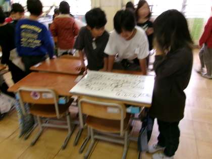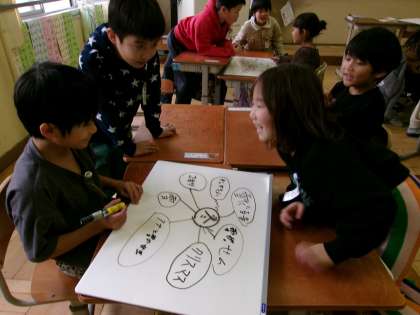 冬と聞いて思い浮かぶことをグループでマッピングしてみました。順にボードに記入していくこと自体も楽しくて、5分間でたくさんの「冬らしい言葉」が集まりました。その後、「これって本当に冬かな?」と思うものや「なるほど!」と思うものを探しに他のグループのマッピングを見て回り、書いた人にどうしてそれを書いたかの理由を話してもらったり、それについての交流をしたりしました。「ひいらぎ」という言葉に初めて出会ったり、「クリスマスにはよくチキンを食べる」という話題が出たりしてみんながイメージする冬をみんなで感じることができました。