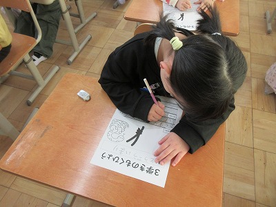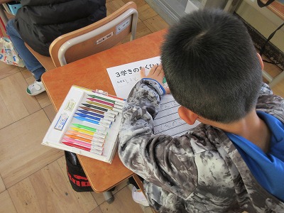 3学期が始まりました。1年生のピンとした姿勢から頑張ろうという気持ちが伝わってきました。3か月後「かっこいい2年生」や「最後まで頑張る2年生」になることを目指して一人ひとり目標をたてました。学習面も生活面もさらなる成長が見られることを期待しています。今年もよろしくお願いします。