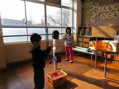 今日は、昔遊びを楽しみました。めんこやけん玉、だるまおとし、お手玉をしました。初めて触れた子もいたようで、「お家にも欲しいな。」と言っている子もいました。