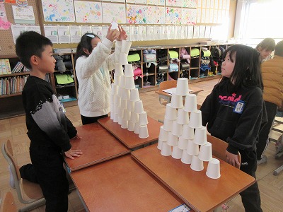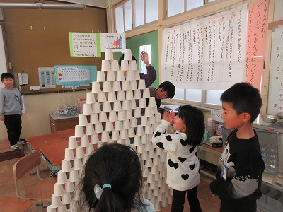 どんなふうに並べたらおもろいかな?今日は、紙コップを並べてみました。最初は4人でやっていましたが「もっと紙コップが欲しい!」という声が上がり、班と班で合体して並べました。最後にはたくさん積み上がり大喜びでした。