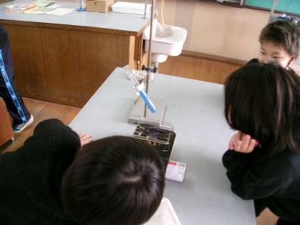 今日は、金属の温まり方を学習した後に、温度で色が変わる教具を使って水の温まり方を予想して実験しました。予想では、「底を温めると底から温まり色が変わる!」という意見が多くありました。実際に実験してみると、金属と水では温まり方に違いがあることを知り、驚いている様子でした。
