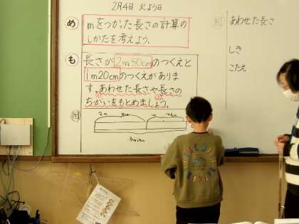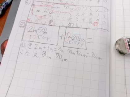 この学習もまとめに入りました。今日は長さの計算をしましたが、センチとミリのときのことを思い出し、すぐに同じ単位どうしを足したり引いたりして答えを求めることができていました。