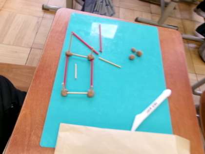 学習の最後に、粘土玉とひごをつかって、はこのかたちを作りました。ひごは12本、粘土玉は8こいることが分かり、辺や頂点の数の確かめとなりました。なかなかひごが立たず苦戦する姿もありましたが、実際に作ってみることで理解を深めることができました。