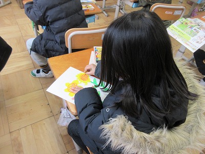 新1年生をお迎えするために、入学式の練習や飾りづくりを頑張っています。今日は、教室のお祝いの飾りのために季節のいろいろなものの絵を描きました。みんなが描いた絵を貼り合わせて飾りを作っています。お兄さん、お姉さんとして頑張っています!