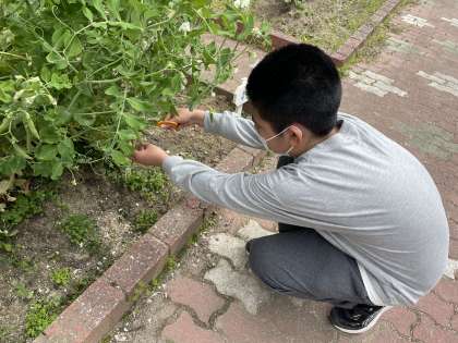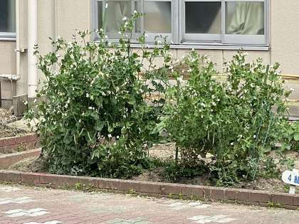 畑で育てているスナップエンドウがたくさんの実をつけました。これまでの水やりや草抜きの成果です。大きなものを選んで収穫しました。