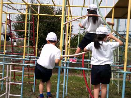 2年生の体育の学習で遊具遊びをしました。2年生のみんなが楽しみにしていた学習です。親指を使って棒を握ること飛び降りたりせず安全に遊ぶように約束をしました。安全に気をつけて休み時間も遊んでほしいと思います。