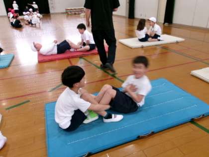 2学年合同で、新体力テストを行いました。今日は上体起こしと立ち幅跳びを測定しました。暑いと言いながらも記録が伸ばせるよう、がんばっていました☆