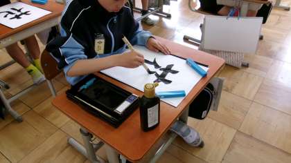 今年度初めての毛筆学習です。今日は「花」を練習しました。今日のめあては、筆使いと画の方向に気をつけよう、です。たて画・横画やはらいの際に、どのように筆の穂先を向けるとよいかを考えながらお手本をよく見て集中して書きました。