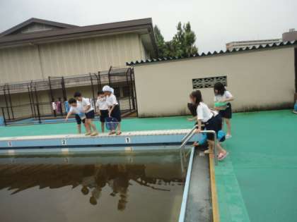 虫かごをもって、学校のプールへ探しにいきました。