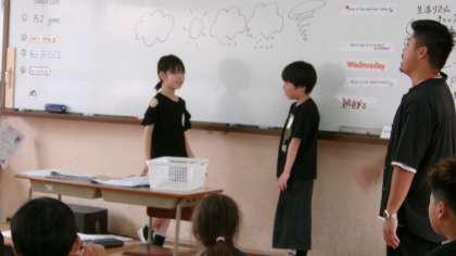 ALTと一緒にハローソングやグッバイソングを練習しました。ジェスチャーをつけながら歌うことで、相手に自分の言いたいことを伝えられるようにします。