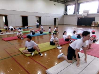1年生を迎える会の練習の後、体育でマット運動をしました。