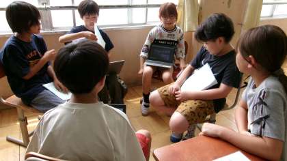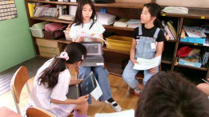 自分の考えをまとめ、例に示す写真を見せながら小グループで発表しました。