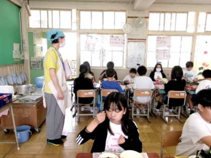給食の時間に栄養教諭の藤川先生が来てくださいました。