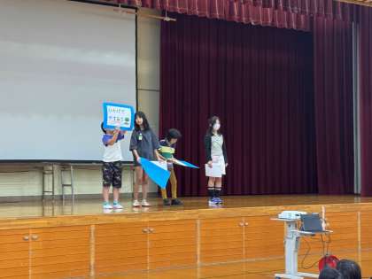 ハロースマイル委員会、The アー図書委員、放送委員会と全校の前でこれからの取組をアナウンスしました。