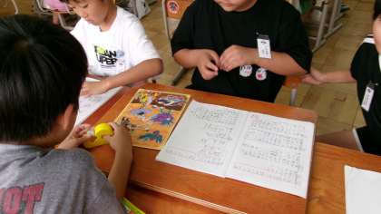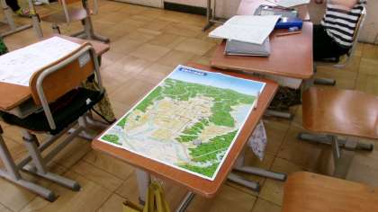 さらに調べたいところを教科書を参考に選び、グループで調べています。工場の多い地域、ニュータウンとして開発されてきた地域、山間部の地域など、地図や資料を見ながら、「池田小学校からの方角」を確かめ、まとめています。