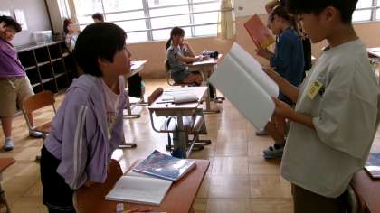 学習の終盤です。題名の「一つの花」の表すもの、込められた思いについて、これまでの学習をふり返りながら考えました。じっくりと自分の考えをまとめた後には、ペアで交流を5回、ペアを変えて行いました。自分とは全然違う考えの人や、似た考えの人様々でしたが、みんなの考えを合わせると、お父さんのゆみこへの思いが深く関係しているのでは・・・・という話にまとまりました。