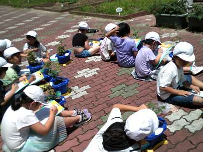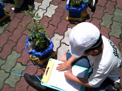 2年生は育てているミニトマトの観察をしました。咲いている花の大きさをものさしを使って測ったり、においをかいだりしました。「星みたいな形だ!」「花の真ん中がとがっている!」と細かく観察していました。
