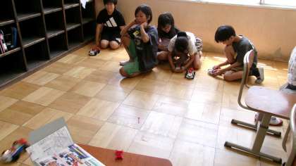 いよいよ、モーターカーを走らせる活動です。これまで学習したことを使って、乾電池の個数、つなぎ方を工夫し、電気を光らせながらモーターカーを走らせました。うまく走らせることができ、大喜びでした。
