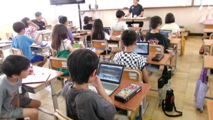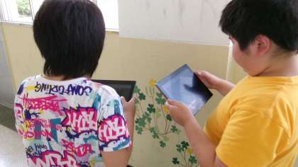初めての総合では、自分たちの学校のじまんを探ります。子どもたちが捉えているじまんだけでなく、今日は校内を回って「これ」と思うものをタブレットで写真に撮りました。次回それを交流し、クラスでのじまんとしてまとめていきます。