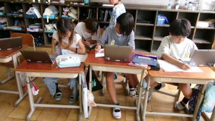 取材を終え、記事の下書き、本書きに入っています。今回の取材では、アンケートを使う人が多かったですが、校内の植物やもうすぐ行く海の家のことをトピックに選んだ人もいます。協力して楽しい新聞にしてほしいと思います。