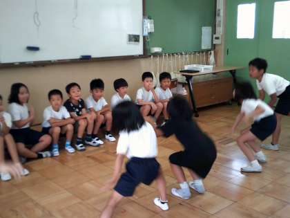 2年生は運動会に向けて池田ロックソーランを練習しました。綱を引くふりではみんな腰を低く落として踊っていてとてもかっこよかったです。友達の踊りのいいところも見つけて伝えあっていました。運動会では準備運動として踊るのでぜひご覧ください。