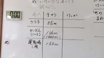 学習の終わりに、いろいろな道のりを調べました。廊下、階段、運動場の一周など巻き尺を使って工夫して測りました。予想を立て、グループで協力して活動しました。