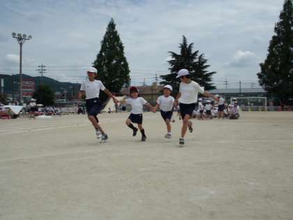 6年生が1年生と手をつなぎ一緒にリレーをしました。