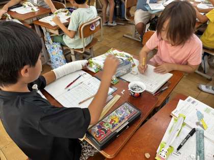 重さの学習が始まりました。1円玉が1グラムであることを用いて、教科書巻末のてんびんで身近な物の重さを測りました。鉛筆は1円玉11枚だから、11グラム。こちらの鉛筆は8枚だから8グラム・・・など鉛筆や消しゴム、定規などを測る活動に子どもたちは夢中になっていました。これから重さの単位を学習していきます。