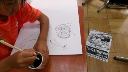 お話の絵に取り組んでいます。4年生は「ドラねこまじんのボタン」というお話の心に残った場面を絵に表現しています。下書きは割りばしペンで描いています。どんな作品になるでしょう、楽しみです。